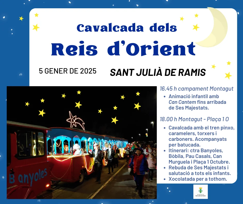 Tradicional campament a l'entrada del veïnat de Montagut, amb animació infantil a càrrec de CAN CANTEM per esperar l'arribada de SEs Majestat amb el tren pinxo. Tot seguit, amb acompanyament de batucada, caramelers, torxers i carboners, la cavalcada es dirigirà, pels carrers del Pla de Baix, cap a la Plaça 1 Octubre, on Ses Majestat seran rebuts per l'alcalde i tots els infants del poble. Hi haurà xocolatada per a tothom!
