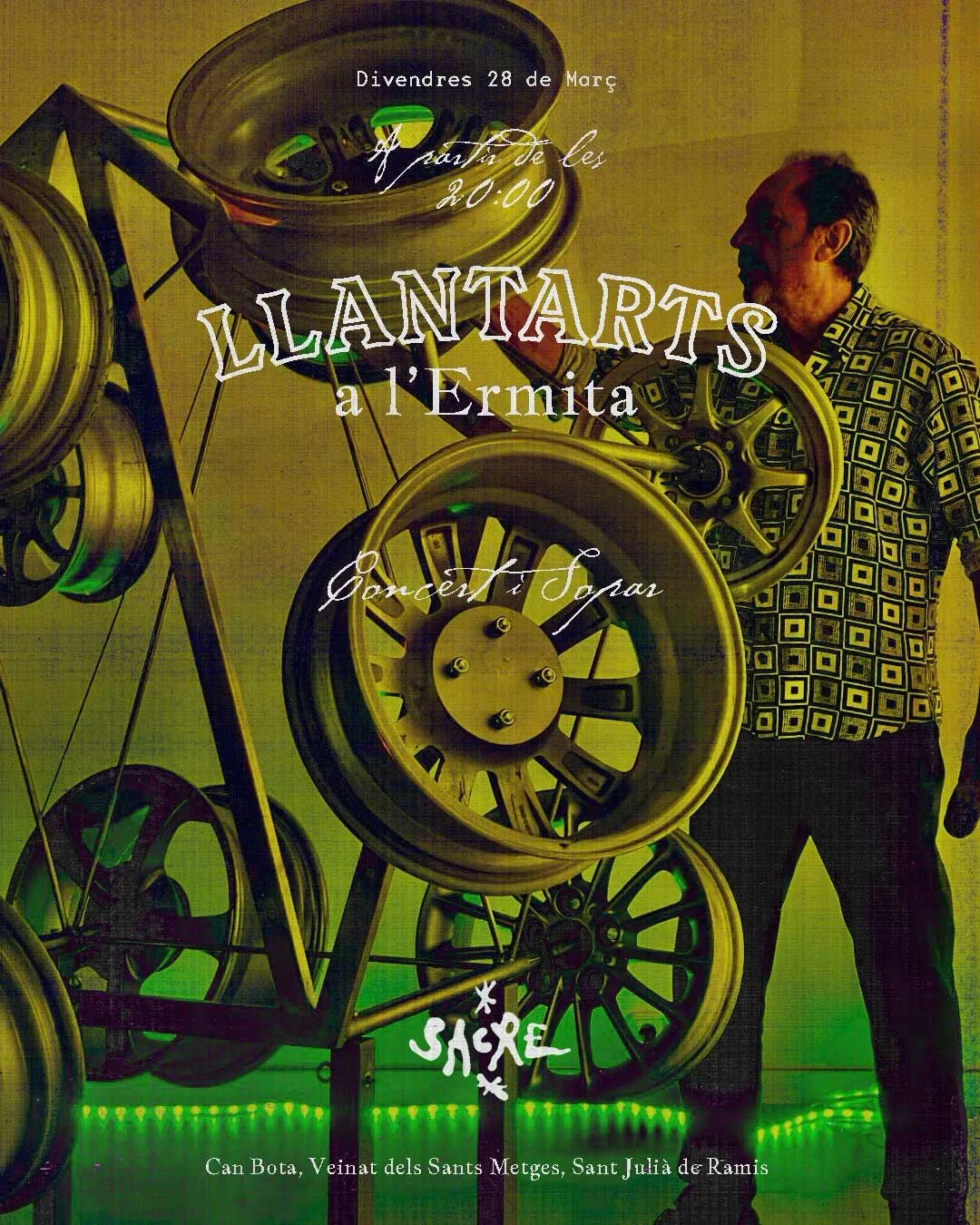 Experiència immersiva dins l’esglèsia dels Sants Metges a través d’un bany sonor amb llantes sòniques.Tindrem en directe a Jesús Asenjo (músic luthier, artista sonor) amb el seu projecte @llant.arts. A partir d’estructures sonores amb llantes de cotxe, tubs i bidons metàl·lics, presenta una performance basada en l’experimentació i la recerca, per a la creació d’espais sonors.Veus envolvents que transiten entreescenaris a vegades còsmics, subaquàtics o de l’inframòn.Serà un actuació dividida en dos sessions:Primer amb una invitació a la meditació i una segona de bany sonor experimental