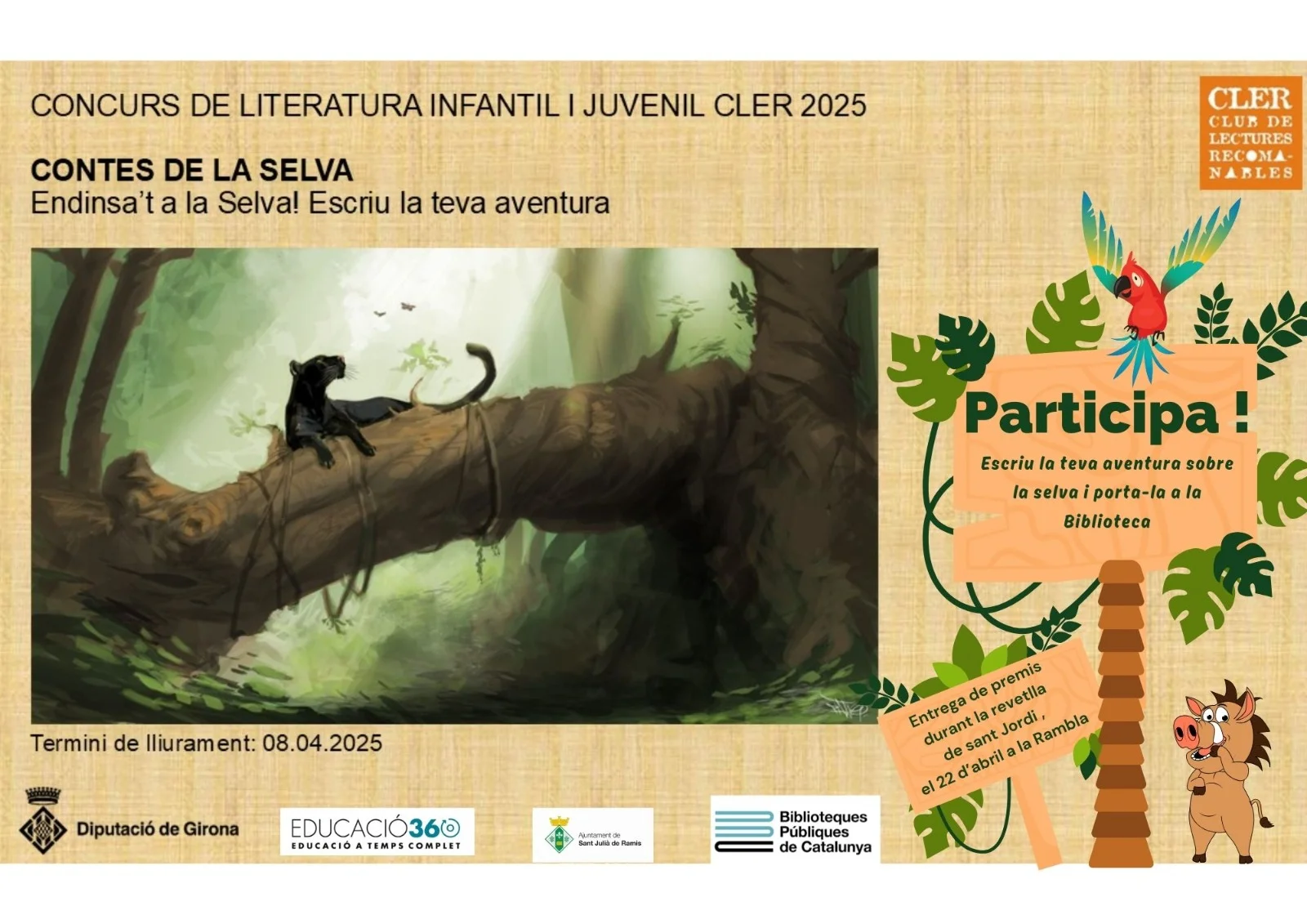 En motiu de Sant Jordi 2025, des de la Biblioteca Neus Català amb l'ajut del CLER (Club de lectures recomanables), es convoca el concurs literari per a nens i nenes de 6 a 14 anys. S'han determinats tres categories per als treballs, contes, que conviden a escriure sobre la selva i les aventures.