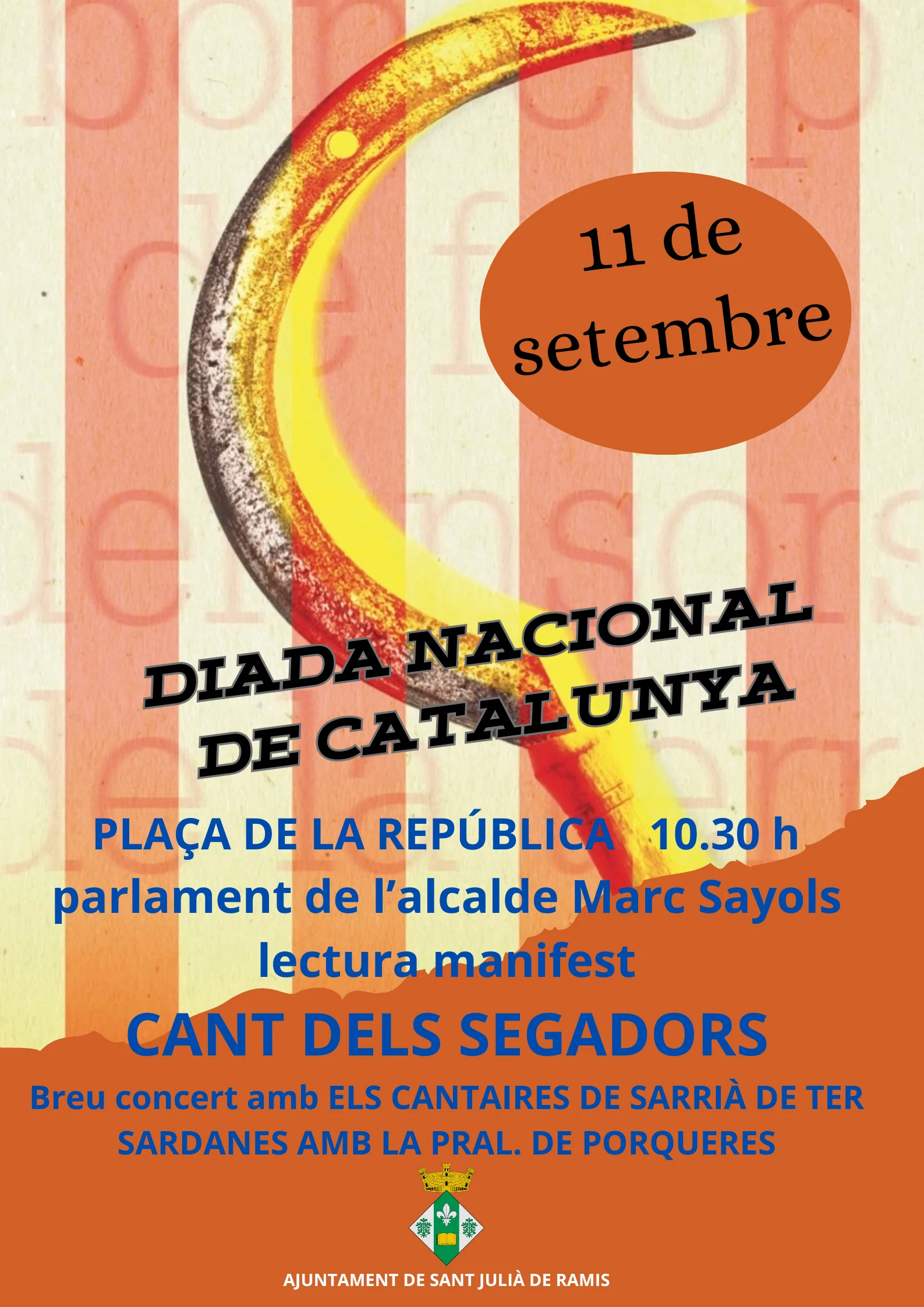Celebració de la Diada nacional de Catalunya a Sant Julià de Ramis. Acte organitzat des de l'Ajuntament amb la participació dels veïns i veïnes i habitualment amb la lectura del manifest de la Diada, concert de la Coral Cantaires de Sarrià i sardanes.